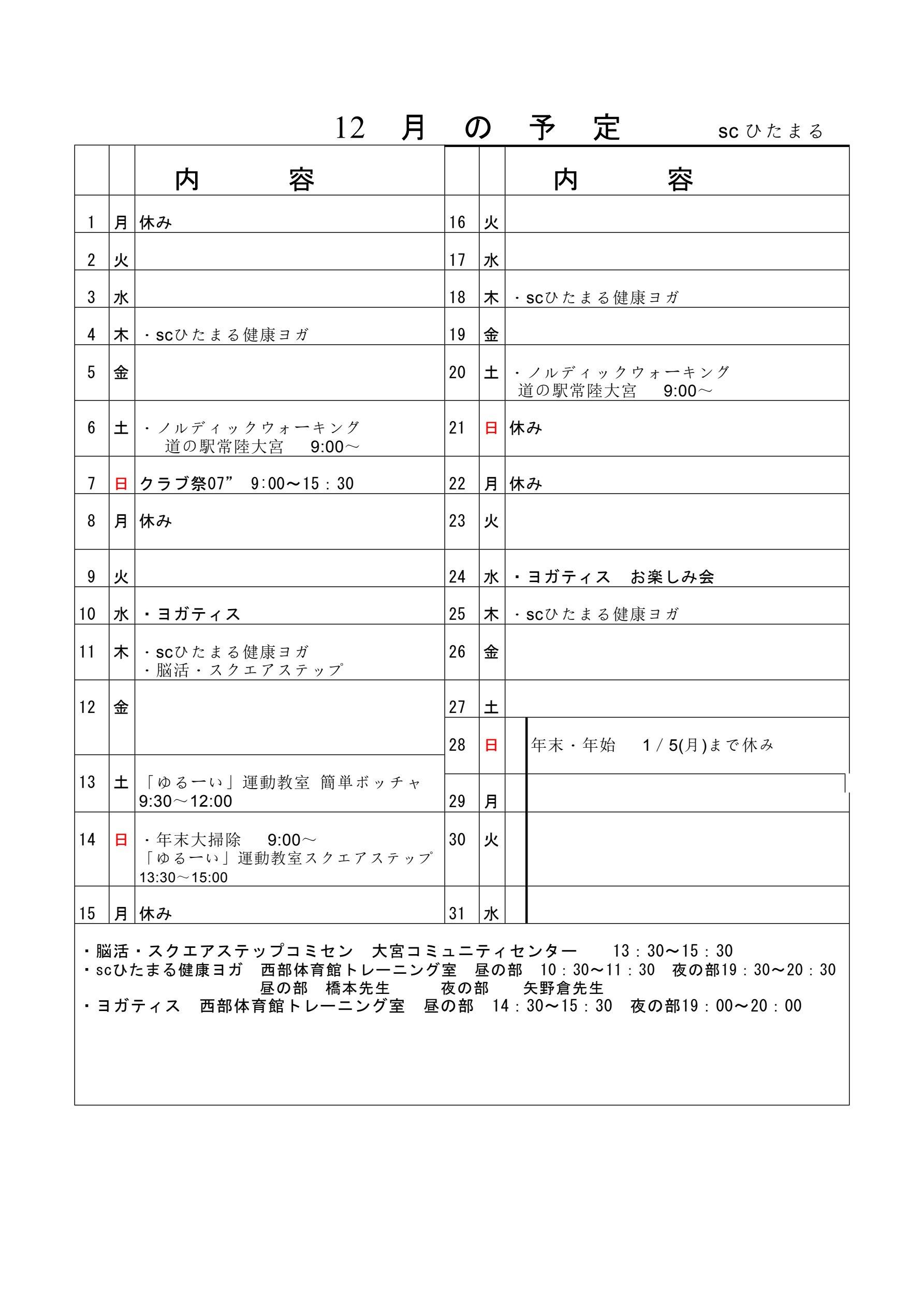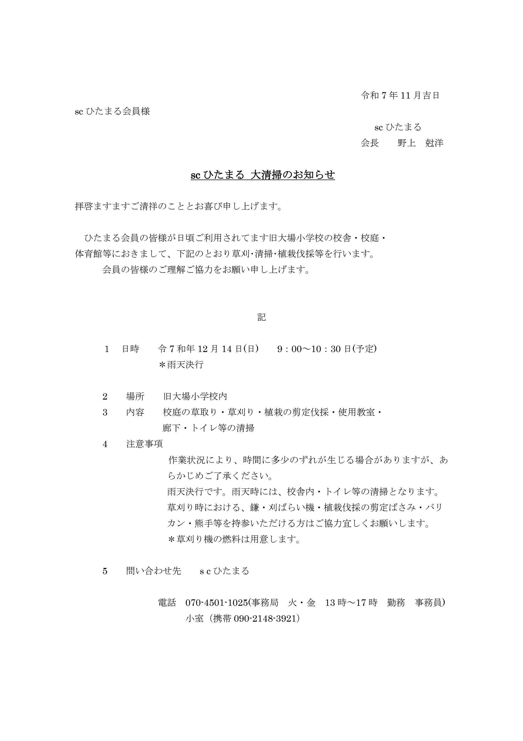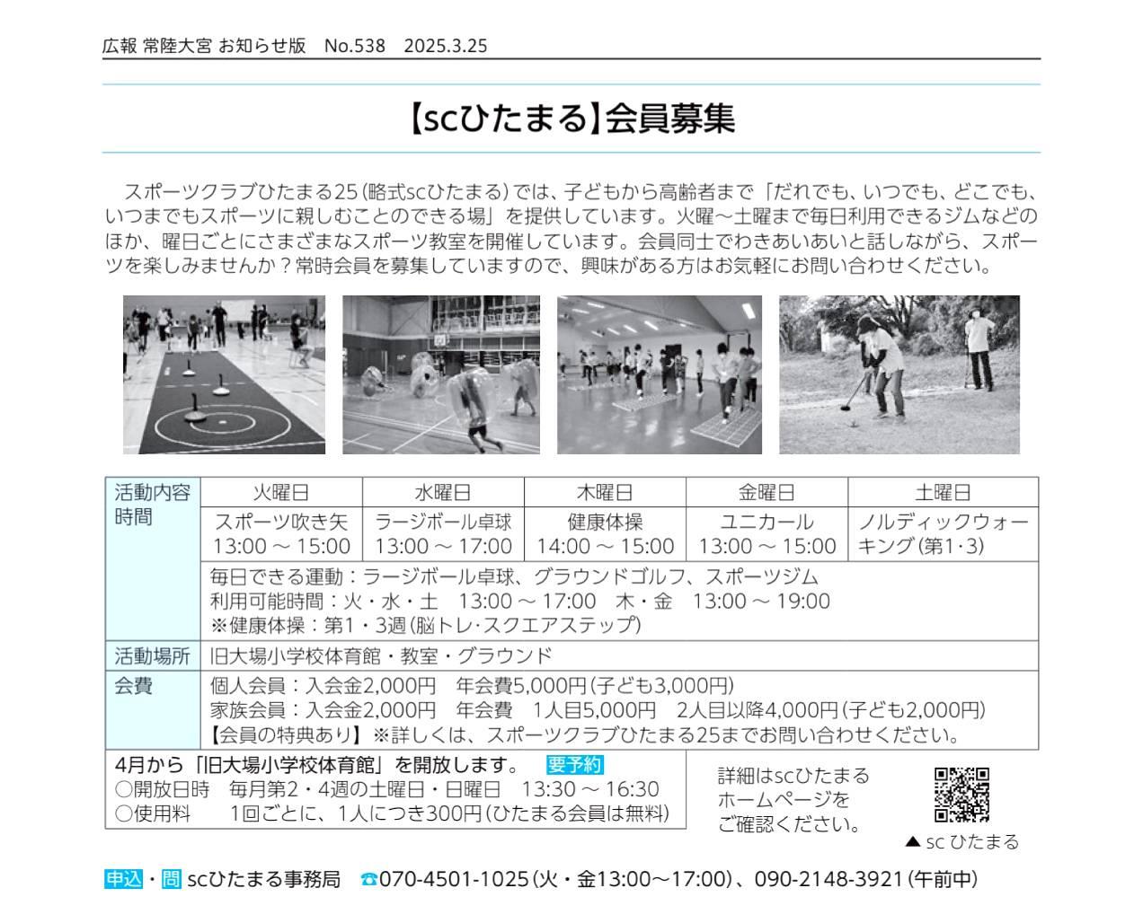 総合型地域スポーツクラブのメリットは、自分の体力や目的にあった種目が選べるので、気軽にスポーツに参加できる事です。また身近にあるので継続的に活動ができ、地域の方々との交流も深まります。当クラブは常陸大宮市の旧大場小学校を拠点に活動しています。 (当クラブは平成25年10月に設立され、クラブ名に「25」が付いてますが、元号が令和になり、また多くの方々からの問いもあり今後は簡略表記として「スポーツクラブひたまる」または「scひたまる」とさせていただきます。)